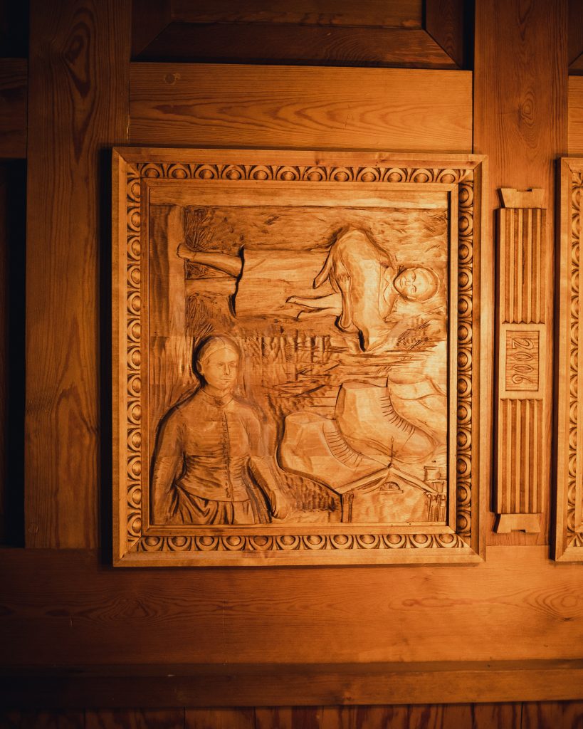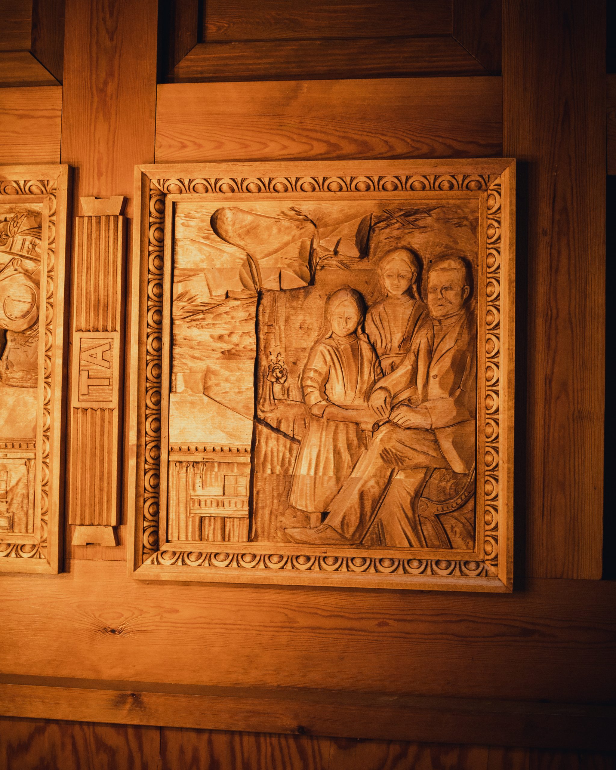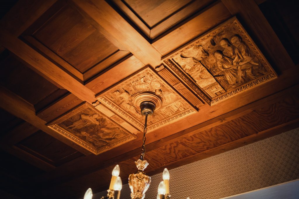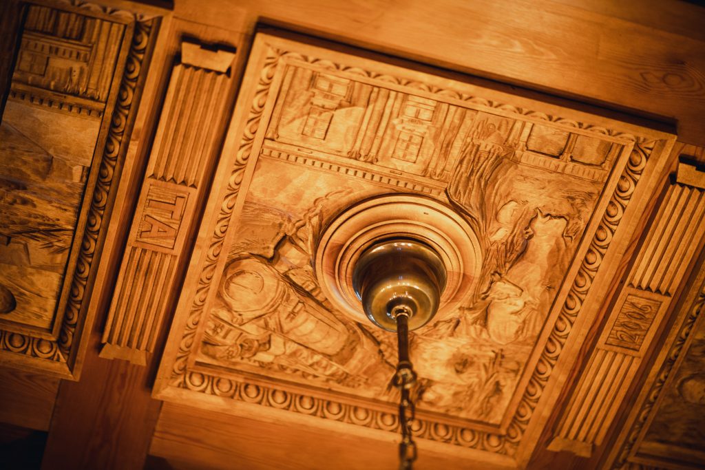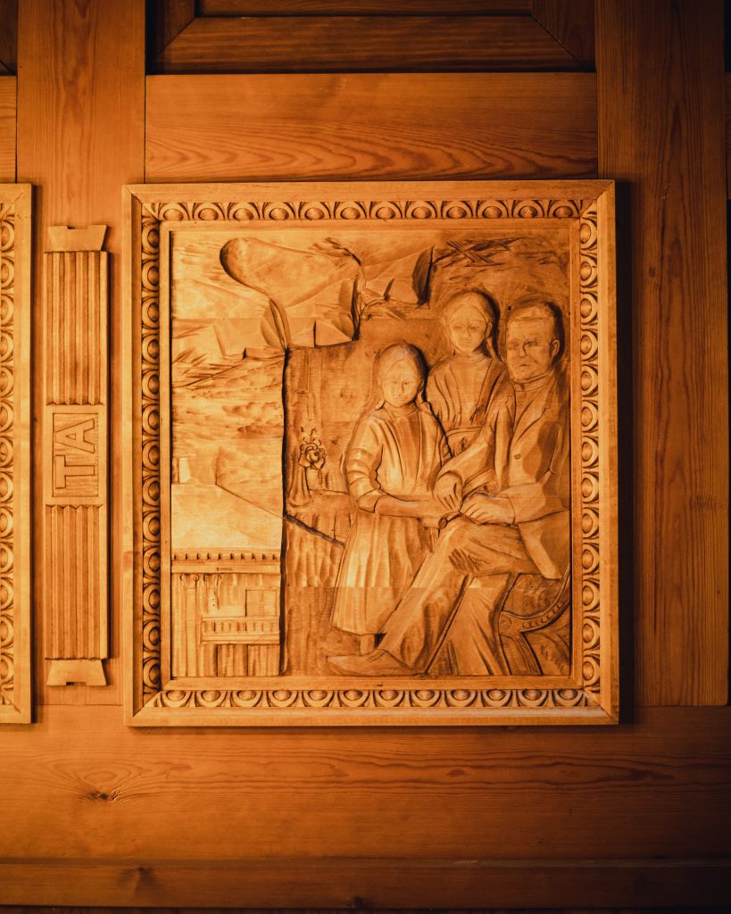 Aaltonen oli muun muassa taidekeräilijä ja ajattelen kattokoristeen olevan ikään kuin yksi teos hänen kokoelmiinsa. Tavoitteeseen yhdistää talon historia ja nykyhetki pyrin modernilla puuveistoksella, joka leikittelee kollaasimaisella sommittelulla ja epätyypillisillä veistoaiheilla, kuten kengät. Koristeellisten kehysten muotokieli sekä kattokoristeen sävy ja pintakäsittely mukailevat vanhan veistoksen ulkonäköä. Triptyykki kertoo tarinaa talon moninaisesta historiasta sekä toimii muistona mittavista kunnostustöistä, jotka valmistuivat 2006.